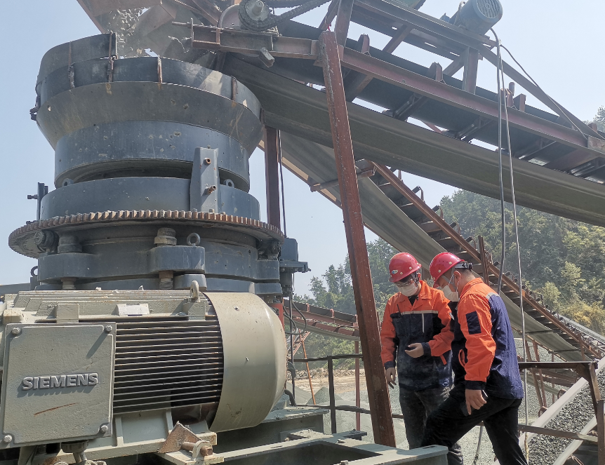 湖北十堰輝綠巖碎石生產(chǎn)線現(xiàn)場,集團(tuán)公司攸工、高工等4人對客戶回訪,設(shè)備有顎破、圓錐破、圓振動篩等,業(yè)主對產(chǎn)品表示滿意,成品顆粒度好。 外購物料,輝綠巖,原料尺寸0-500mm, 成品為0-3㎜.3-6mm機(jī)制砂,8-16mm
