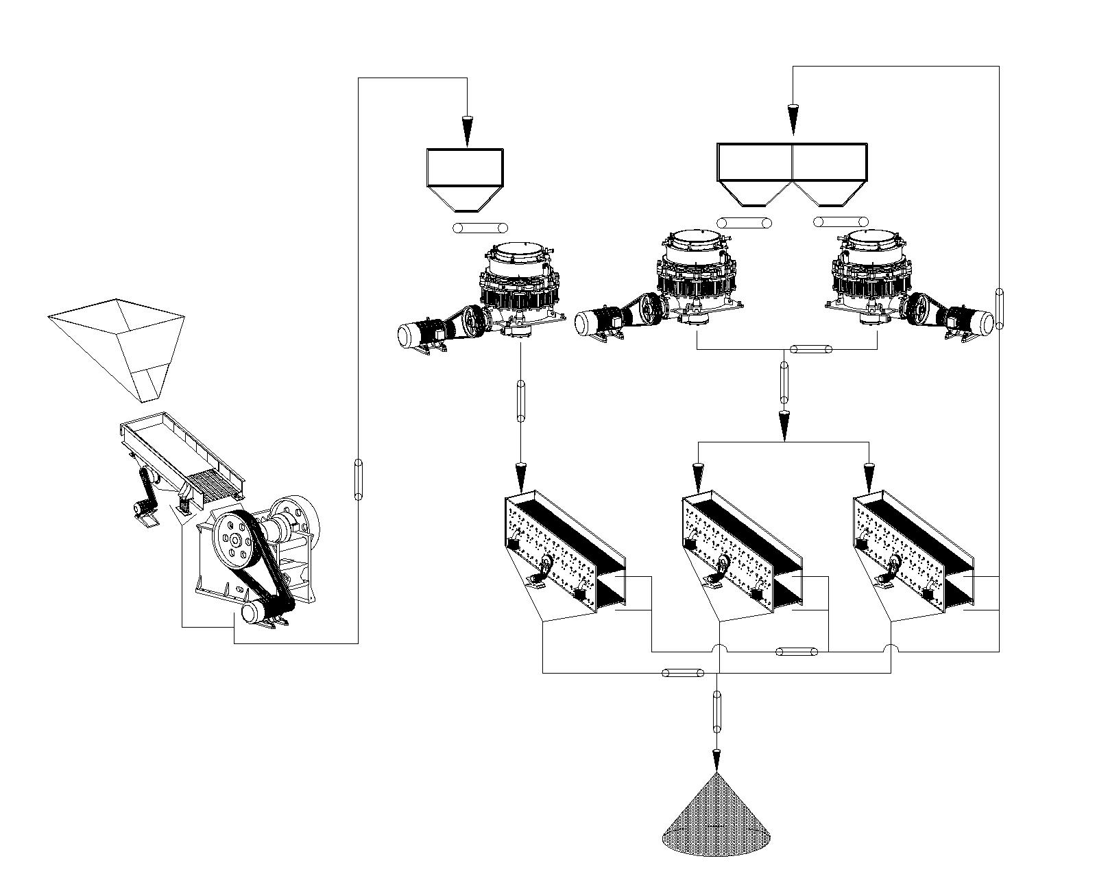 基于此,世邦技術(shù)團(tuán)隊(duì)結(jié)合現(xiàn)場(chǎng)勘察數(shù)據(jù),為客戶制定了“粗碎+中細(xì)碎+篩分”三級(jí)破碎工藝方案。